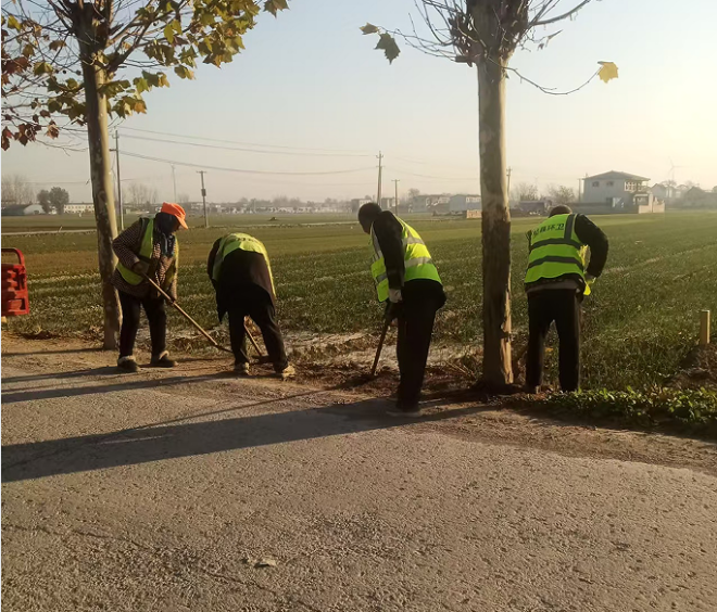 针对农村区域分散、道路狭窄、落叶分布不均的特点,项目组精准施策优化作业方案。一方面,合理划分清扫片区,组织环卫保洁队伍分片包干,重点对村内主干道、文化广场、党群服务中心、学校周边、村口道路等人员活动密集区域开展集中清扫,同时兼顾房前屋后、田间小道、沟渠两侧等薄弱部位,确保落叶“扫得净、清得完”。另一方面,采用“人工清扫+小型机械辅助”的作业模式,小型清扫车穿梭于村内主干道提高作业效率,保洁人员手持扫帚、铁锨对小巷、角落进行精细化清理,避免机械作业盲区遗漏。