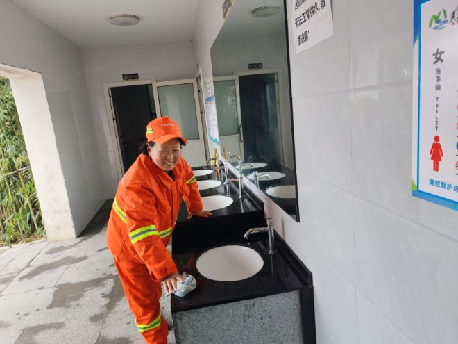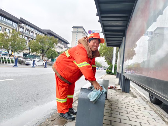 吕敏和闫桂莲则是“城市家具”的贴心“美容师”,她们的身影穿梭在城区的公共卫生间和公交站台之间。擦拭公交站台座位时,她们会先喷上专用清洁剂,再用微湿的抹布反复擦拭,连座椅的缝隙、扶手的拐角都不放过,最后用干抹布擦干水渍,确保没有一丝灰尘、一点痕迹。清理公共洗手间时,从镜面、洗手台到地面、角落,她们逐一清洁消毒。寒冬里,她们的双手被冻得通红干裂,却依旧动作麻利;酷暑时,汗水浸透衣衫,她们也顾不上擦拭,只为让市民用上干净整洁的公共设施。