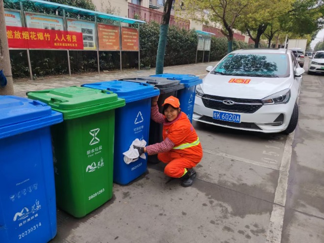 孟丽则用极致的细致,守护着片区里的每一个垃圾桶。她负责的路段垃圾桶始终保持着干净清爽的模样,看不到一点污渍、闻不到一丝异味。每天她都会按时对垃圾桶进行全方位清洁:先将桶内垃圾清运干净,再用高压水枪冲洗桶身内外,然后用抹布蘸取清洁剂,仔细擦拭桶身的油污和小广告,最后用清水冲净、晾干。遇到垃圾桶周边有遗漏的垃圾,她会第一时间清理干净。多少个日日夜夜,多少个风雨寒暑,她始终坚守如初,用看似平凡的小事,筑牢城市环境卫生的“最后一道防线”。